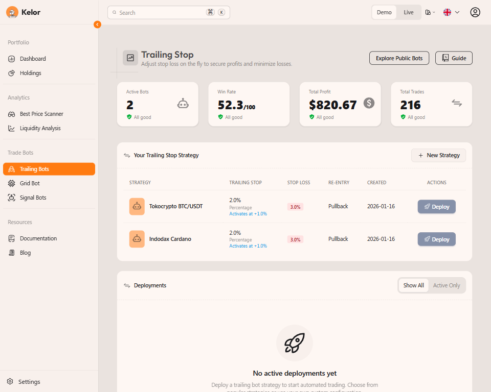 Access features that exchanges don't always provide, like automated stop losses and trailing stops to protect your investments.